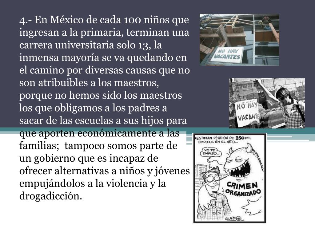 4.- En México de cada 100 niños que ingresan a la primaria, terminan una carrera universitaria solo 13, la inmensa mayoría se va quedando en el camino por diversas causas que no son atribuibles a los maestros, porque no hemos sido los maestros los que obligamos a los padres a sacar de las escuelas a sus hijos para que aporten económicamente a las familias; tampoco somos parte de un gobierno que es incapaz de ofrecer alternativas a niños y jóvenes empujándolos a la violencia y la drogadicción.