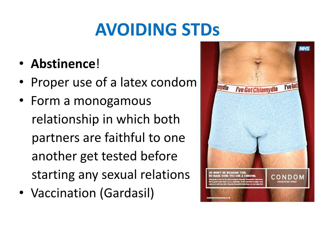 AVOIDING STDs • Abstinence! • Proper use of a latex condom • Form a monogamous relationship in which both partners are faithful to one another get tested before starting any sexual relations • Vaccination (Gardasil)