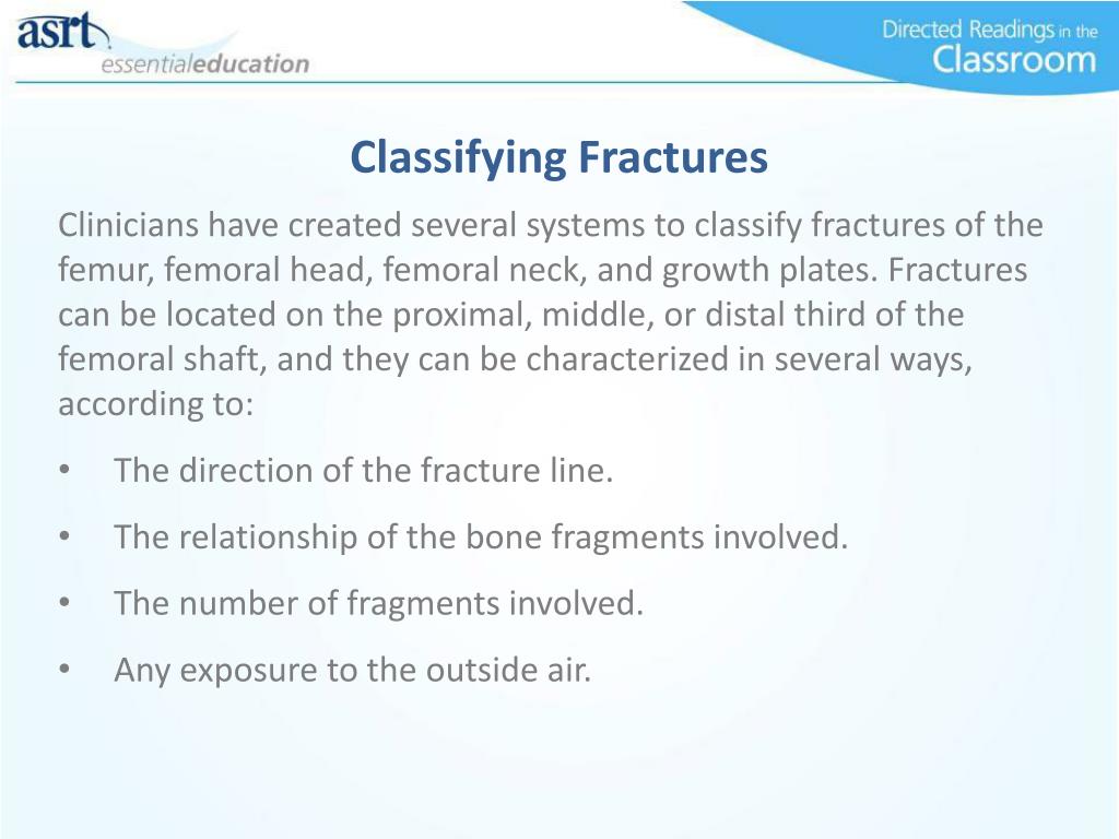 Classifying Fractures • Clinicians have created several systems to classify fractures of the femur, femoral head, femoral neck, and growth plates. Fractures can be located on the proximal, middle, or distal third of the femoral shaft,and they can be characterized in several ways, according to: • The direction of the fracture line. • The relationship of the bone fragments involved. • The number of fragments involved. • Any exposure to the outside air.