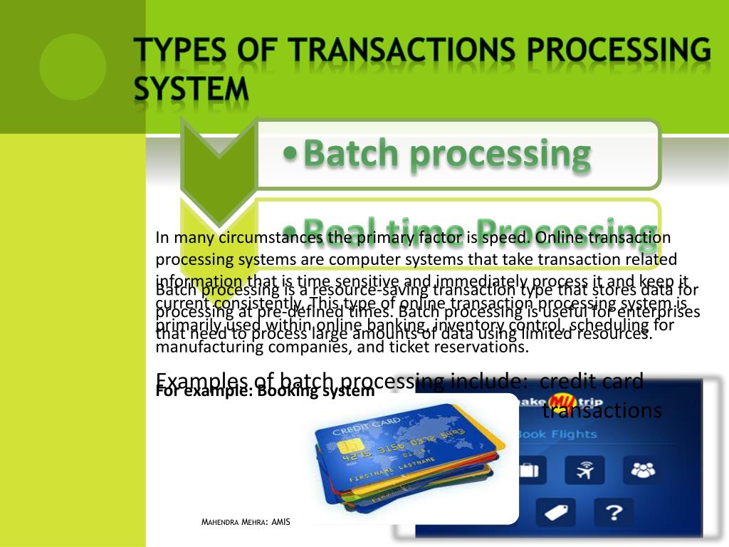 Batch processing Types of Transactions Processing system • Real time Processing In many circumstances the primary factor is speed. Online transaction processing systems are computer systems that take transaction related information that is time sensitive and immediately process it and keep it current consistently. This type of online transaction processing system is primarily used within online banking, inventory control, scheduling for manufacturing companies, and ticket reservations. For example: Booking system Batch processing is a resource-saving transaction type that stores data for processing at pre-defined times. Batch processing is useful for enterprises that need to process large amounts of data using limited resources. Examples of batch processing include: credit card transactions Mahendra Mehra: AMIS