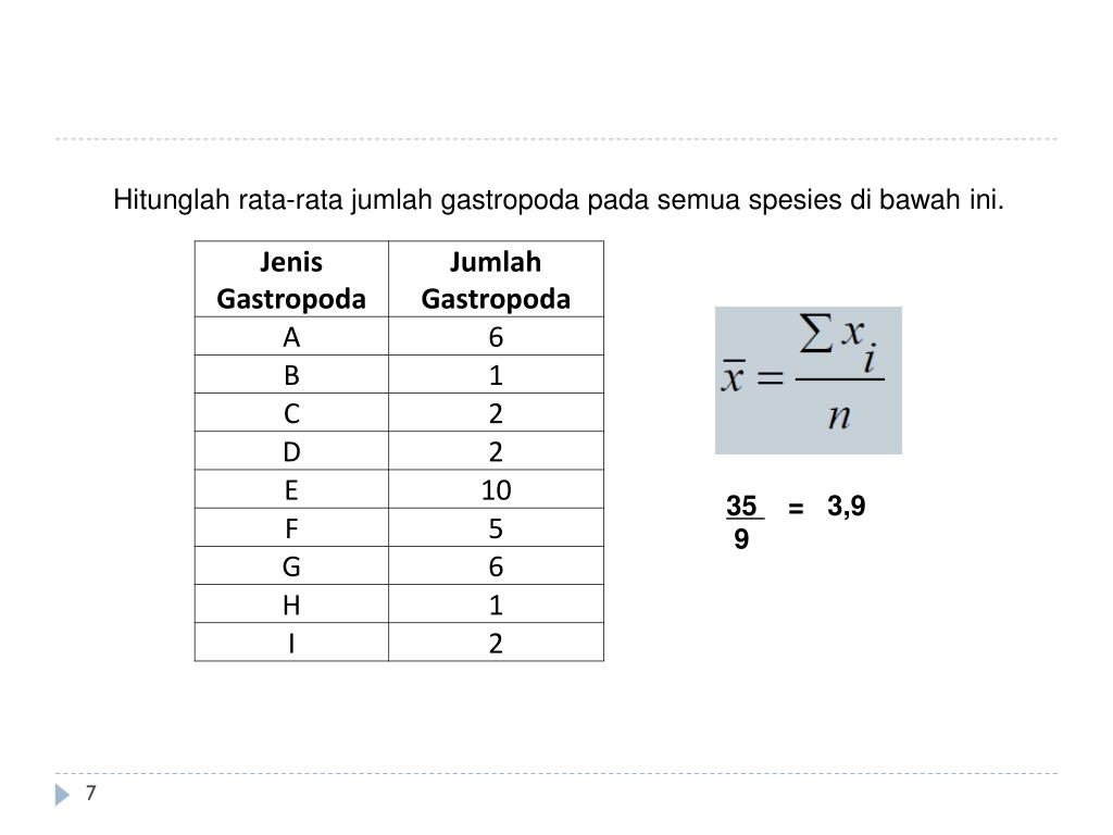 Hitunglah rata-rata jumlah gastropoda pada semua spesies di bawah ini. 35 = 3,9 9
