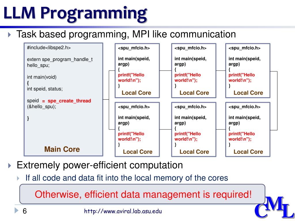 LLM Programming <spu_mfcio.h> int main(speid, argp) { printf("Hello world!\n"); } <spu_mfcio.h> int main(speid, argp) { printf("Hello world!\n"); } <spu_mfcio.h> int main(speid, argp) { printf("Hello world!\n"); } <spu_mfcio.h> int main(speid, argp) { printf("Hello world!\n"); } <spu_mfcio.h> int main(speid, argp) { printf("Hello world!\n"); } <spu_mfcio.h> int main(speid, argp) { printf("Hello world!\n"); } #include<libspe2.h> extern spe_program_handle_t hello_spu; int main(void) { int speid, status; speid (&hello_spu); } Local Core Local Core Local Core Local Core Local Core Local Core = spe_create_thread Main Core • Extremely power-efficient computation • If all code and data fit into the local memory of the cores Otherwise, efficient data management is required! Task based programming, MPI like communication
