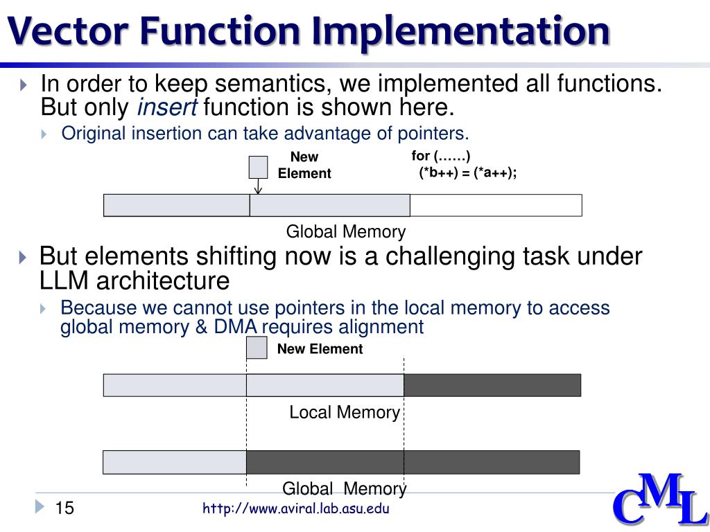 Vector Function Implementation • In order to keep semantics, we implemented all functions. But only insert function is shown here. • Original insertion can take advantage of pointers. for (……) (*b++) = (*a++); New Element Global Memory New Element Local Memory Global Memory • But elements shifting now is a challenging task under LLM architecture • Because we cannot use pointers in the local memory to access global memory & DMA requires alignment