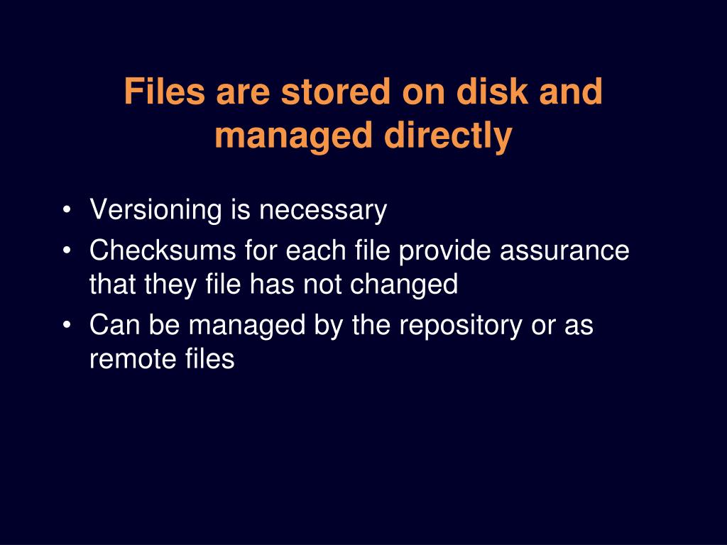 Files are stored on disk and managed directly • Versioning is necessary • Checksums for each file provide assurance that they file has not changed • Can be managed by the repository or as remote files