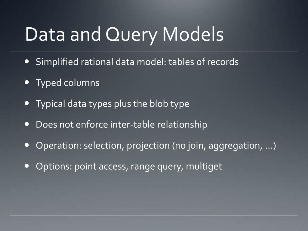 Data and Query Models • Simplified rational data model: tables of records • Typed columns • Typical data types plus the blob type • Does not enforce inter-table relationship • Operation: selection, projection (no join, aggregation, …) • Options: point access, range query, multiget