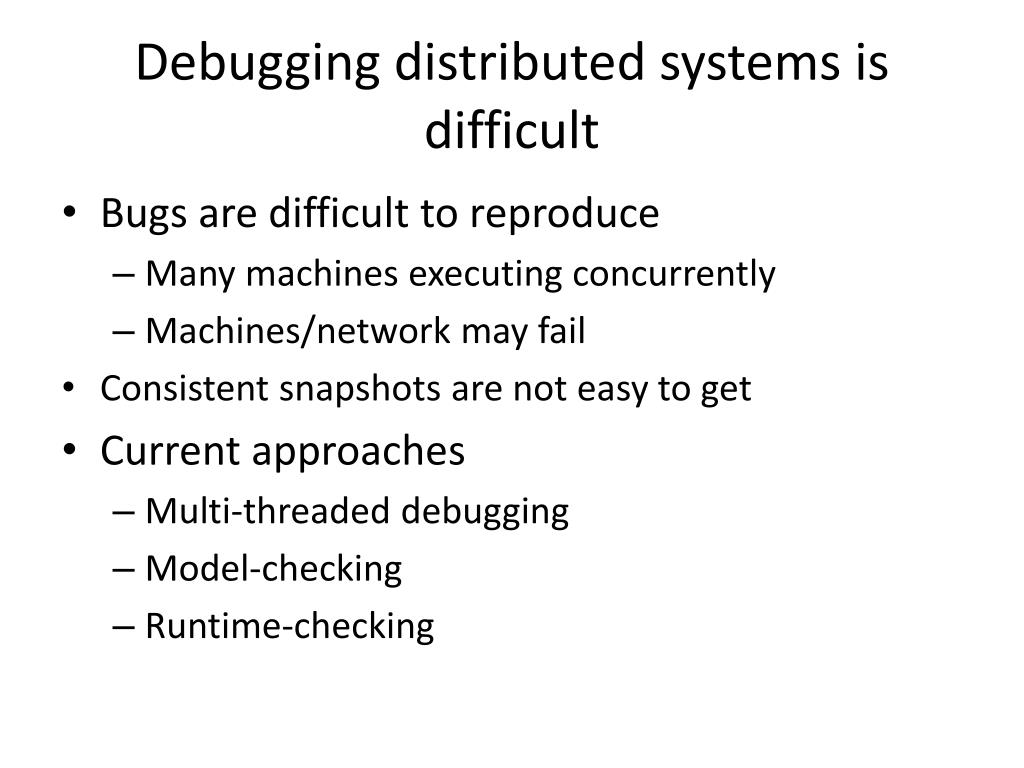 Debugging distributed systems is difficult • Bugs are difficult to reproduce • Many machines executing concurrently • Machines/network may fail • Consistent snapshots are not easy to get • Current approaches • Multi-threaded debugging • Model-checking • Runtime-checking
