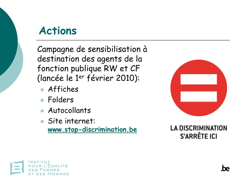 Actions Campagne de sensibilisation à destination des agents de la fonction publique RW et CF (lancée le 1er février 2010): • Affiches • Folders • Autocollants • Siteinternet: www.stop-discrimination.be