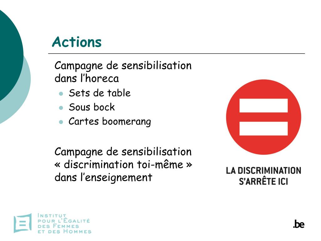 Actions Campagne de sensibilisation dans l’horeca • Sets de table • Sous bock • Cartes boomerang Campagne de sensibilisation « discrimination toi-même » dans l’enseignement