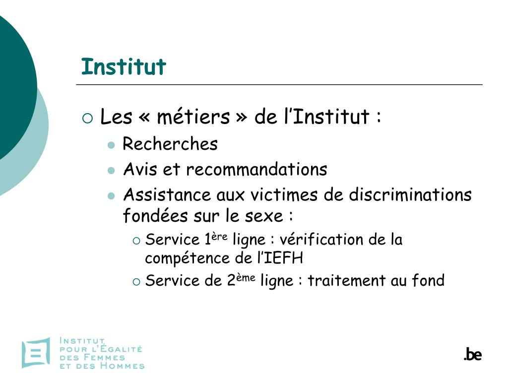 Institut • Les « métiers » de l’Institut : • Recherches • Avis et recommandations • Assistance aux victimes de discriminations fondées sur le sexe : • Service 1ère ligne : vérification de la compétence de l’IEFH • Service de 2ème ligne : traitement au fond