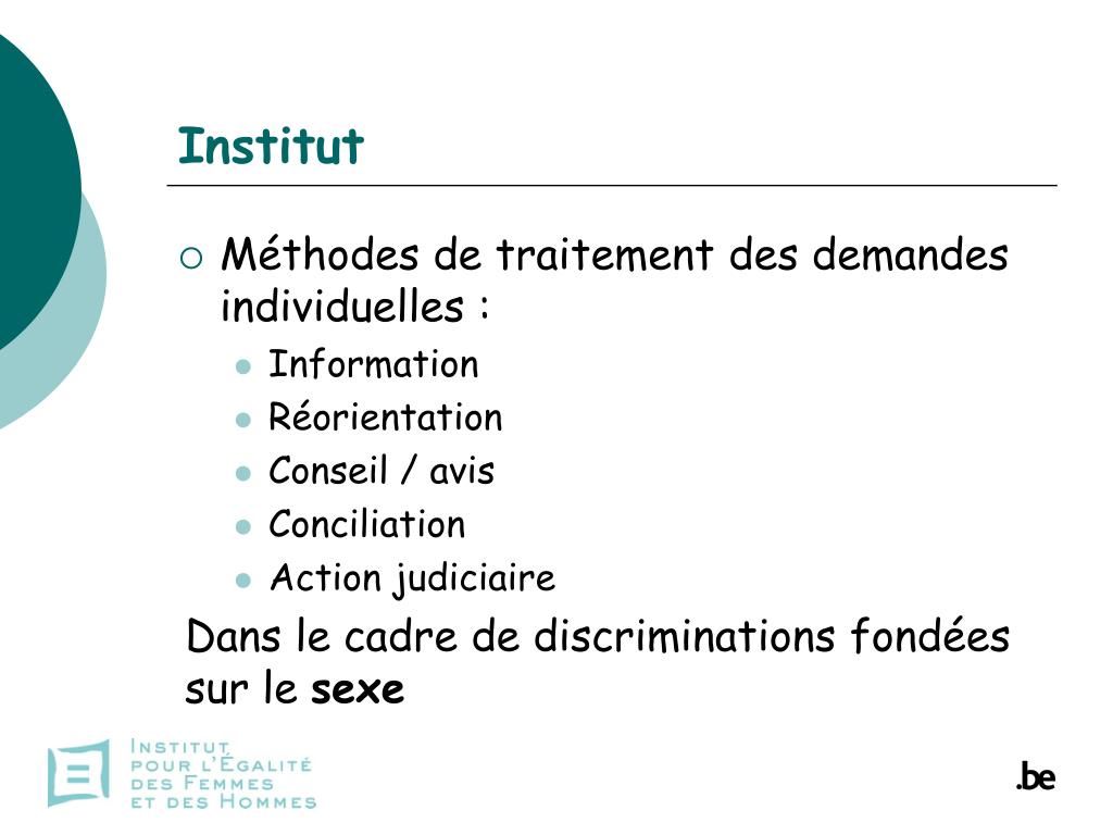 Institut • Méthodes de traitement des demandes individuelles : • Information • Réorientation • Conseil / avis • Conciliation • Action judiciaire Dans le cadre de discriminations fondées sur le sexe