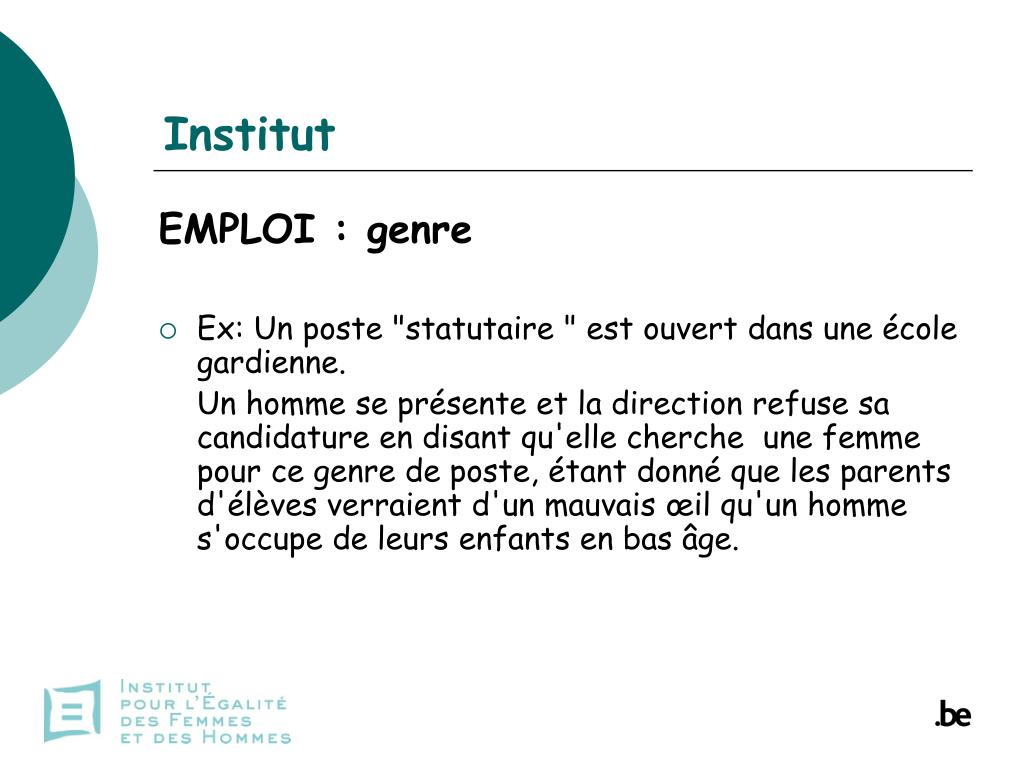 Institut EMPLOI : genre • Ex: Un poste "statutaire " est ouvert dans une école gardienne. Un homme se présente et la direction refuse sa candidature en disant qu'elle cherche une femme pour ce genre de poste, étant donné que les parents d'élèves verraient d'un mauvais œil qu'un homme s'occupe de leurs enfants en bas âge.
