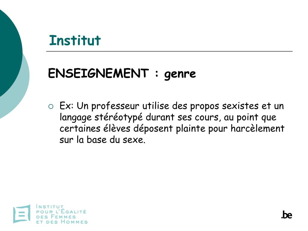 Institut ENSEIGNEMENT : genre • Ex: Un professeur utilise des propos sexistes et un langage stéréotypé durant ses cours, au point que certaines élèves déposent plainte pour harcèlement sur la base du sexe.