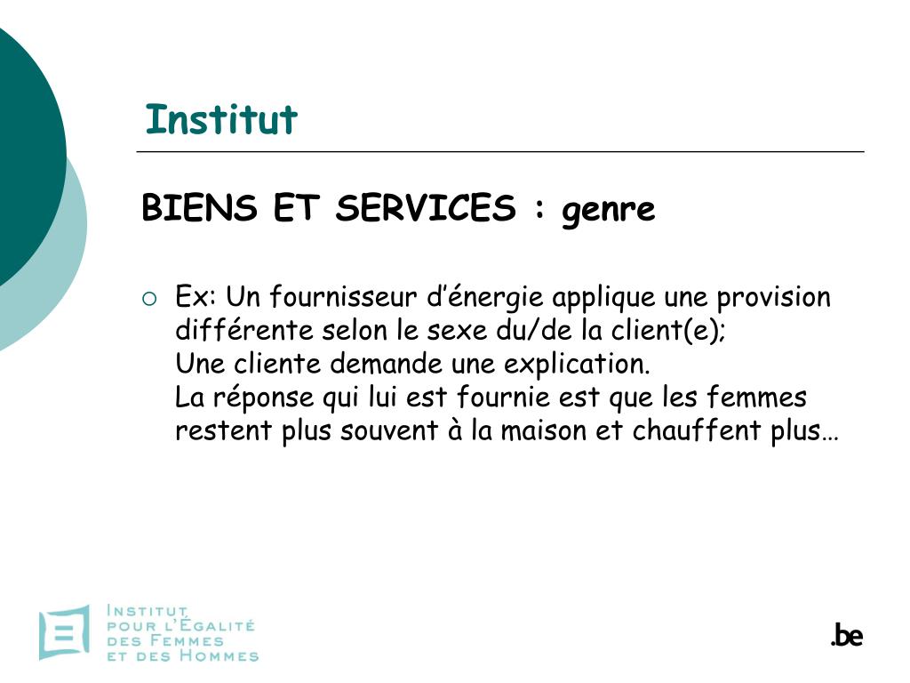 Institut BIENS ET SERVICES : genre • Ex: Un fournisseur d’énergie applique une provision différente selon le sexe du/de la client(e); Une cliente demande une explication. La réponse qui lui est fournie est que les femmes restent plus souvent à la maison et chauffent plus…