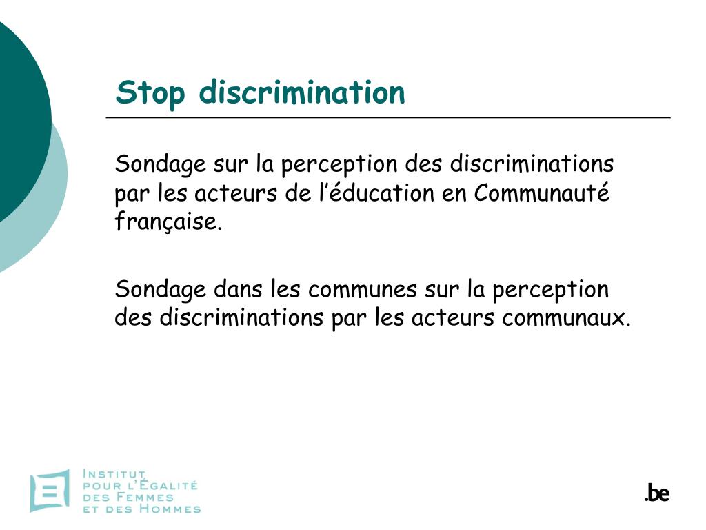 Stop discrimination Sondage sur la perception des discriminations par les acteurs de l’éducation en Communauté française. Sondage dans les communes sur la perception des discriminations par les acteurs communaux.