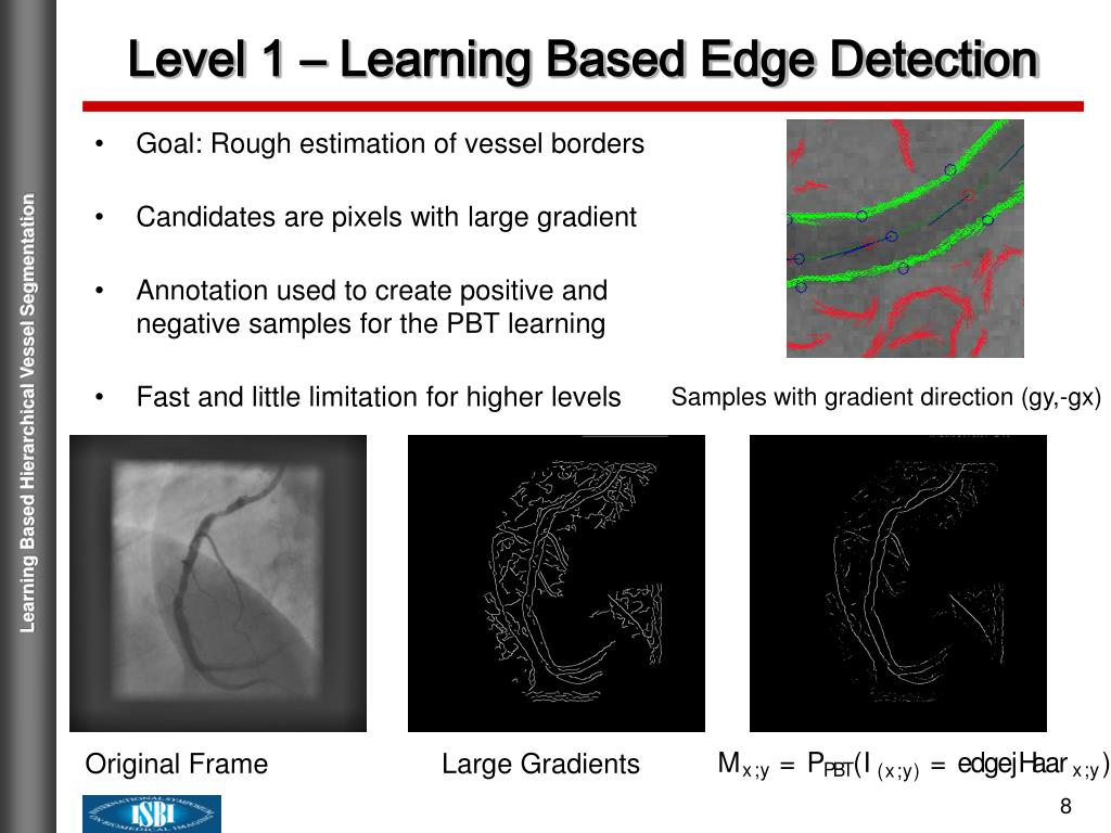 Level 1 – Learning Based Edge Detection Samples with gradient direction (gy,-gx) Original Frame Large Gradients Goal: Rough estimation of vessel borders Candidates are pixels with large gradient Annotation used to create positive and negative samples for the PBT learning Fast and little limitation for higher levels