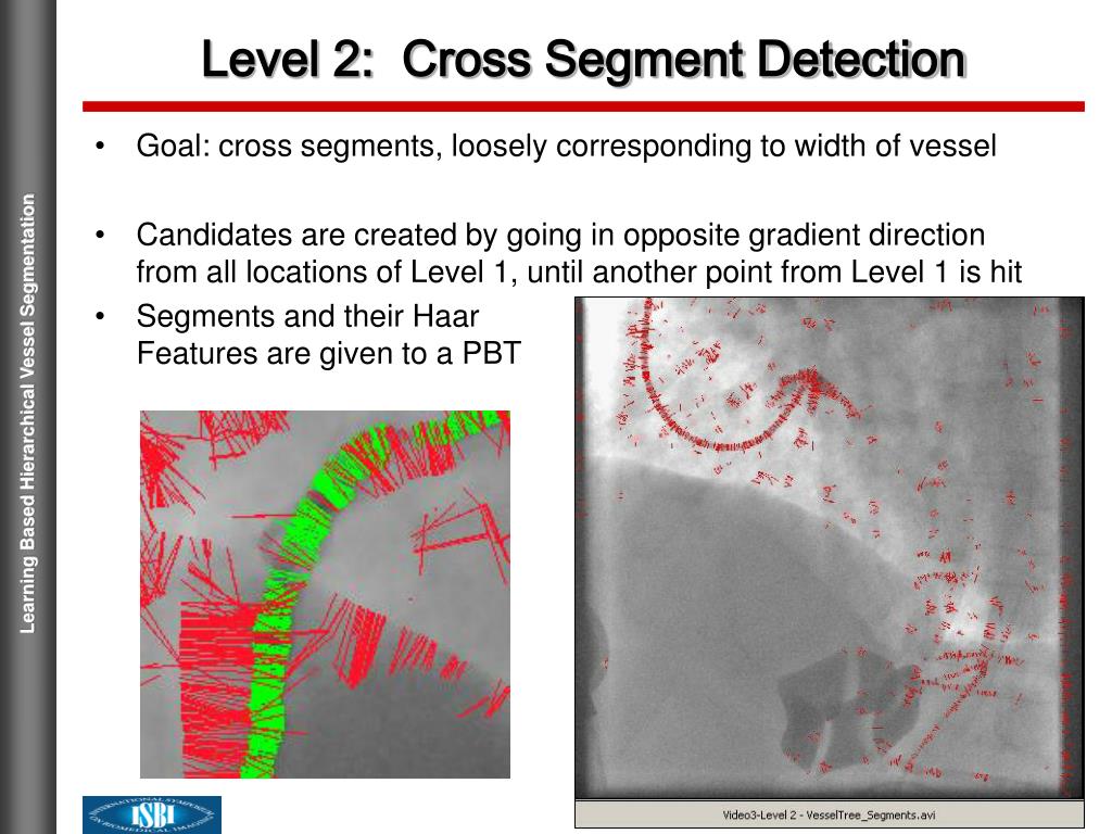 Level 2: Cross Segment Detection Goal: cross segments, loosely corresponding to width of vessel Candidates are created by going in opposite gradient direction from all locations of Level 1, until another point from Level 1 is hit Segments and their Haar Features are given to a PBT