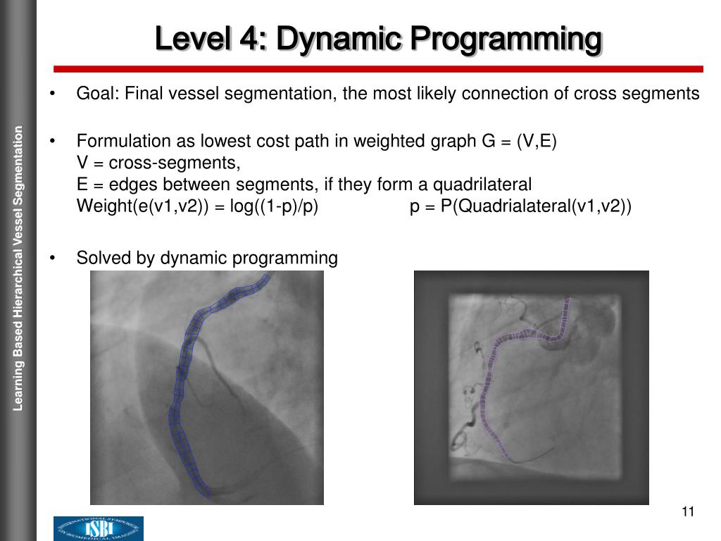 Level 4: Dynamic Programming Goal: Final vessel segmentation, the most likely connection of cross segments Formulation as lowest cost path in weighted graph G = (V,E)V = cross-segments, E = edges between segments, if they form a quadrilateralWeight(e(v1,v2)) = log((1-p)/p) p = P(Quadrialateral(v1,v2)) Solved by dynamic programming