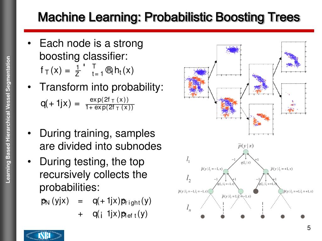 Machine Learning: Probabilistic Boosting Trees Each node is a strong boosting classifier: Transform into probability: During training, samples are divided into subnodes During testing, the top recursively collects the probabilities: