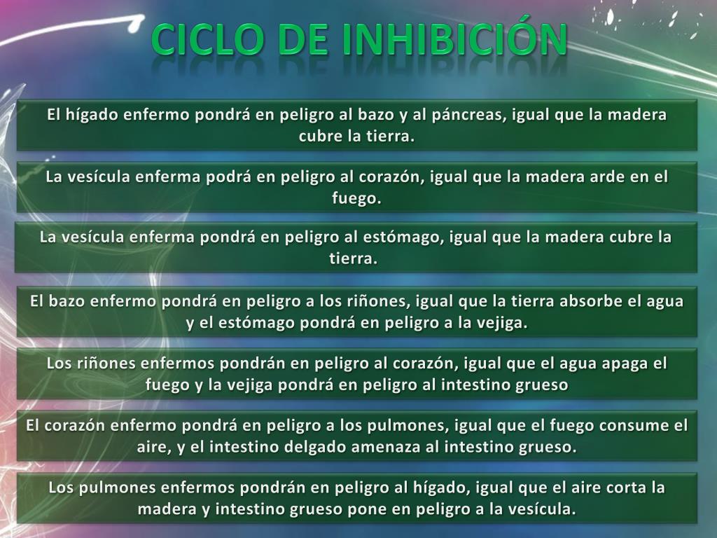 Ciclo de INHIBICIÓN El hígado enfermo pondrá en peligro al bazo y al páncreas, igual que la madera cubre la tierra. • La vesícula enferma podrá en peligro al corazón, igual que la madera arde en el fuego. • La vesícula enferma pondrá en peligro al estómago, igual que la madera cubre la tierra. El bazo enfermo pondrá en peligro a los riñones, igual que la tierra absorbe el agua y el estómago pondrá en peligro a la vejiga. Los riñones enfermos pondrán en peligro al corazón, igual que el agua apaga el fuego y la vejiga pondrá en peligro al intestino grueso El corazón enfermo pondrá en peligro a los pulmones, igual que el fuego consume el aire, y el intestino delgado amenaza al intestino grueso. • Los pulmones enfermos pondrán en peligro al hígado, igual que el aire corta la madera y intestino grueso pone en peligro a la vesícula.
