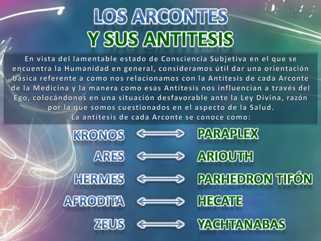 LOS ARCONTES Y SUS ANTITESIS En vista del lamentable estado de Consciencia Subjetiva en el que se encuentra la Humanidad en general, consideramos útil dar una orientación básica referente a como nos relacionamos con la Antítesis de cada Arconte de la Medicina y la manera como esas Antítesis nos influencian a través del Ego, colocándonos en una situación desfavorable ante la Ley Divina, razón por la que somos cuestionados en el aspecto de la Salud. La antítesis de cada Arconte se conoce como: PARAPLEX KRONOS Ares ARIOUTH HERMES pARHEDRON TIFÓN AFRODITA HECATE ZEUS YACHTANABAS