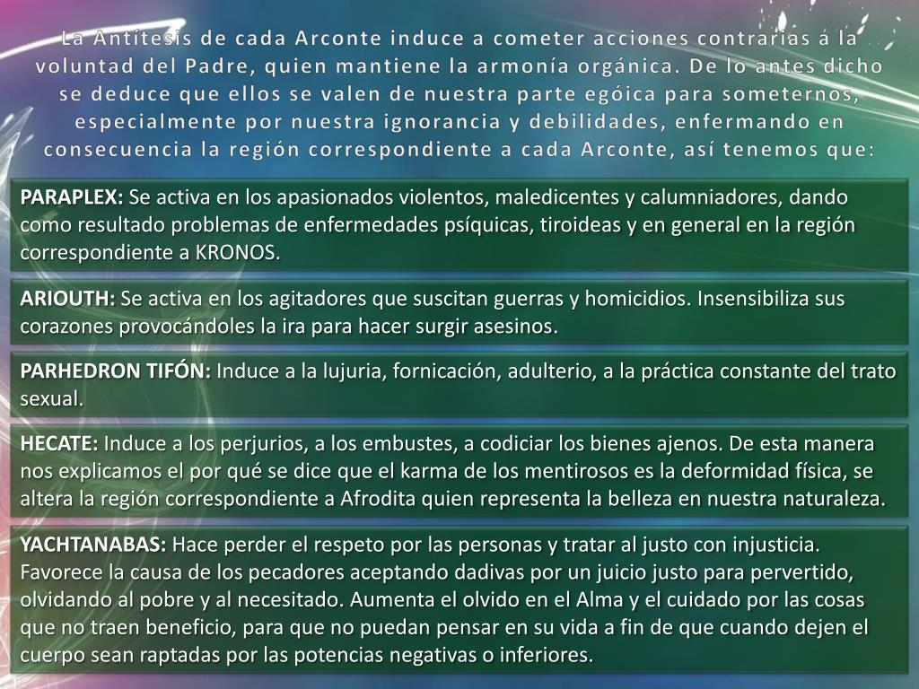 La Antítesis de cada Arconte induce a cometer acciones contrarias a la voluntad del Padre, quien mantiene la armonía orgánica. De lo antes dicho se deduce que ellos se valen de nuestra parte egóica para someternos, especialmente por nuestra ignorancia y debilidades, enfermando en consecuencia la región correspondiente a cada Arconte, así tenemos que: PARAPLEX: Se activa en los apasionados violentos, maledicentes y calumniadores, dando como resultado problemas de enfermedades psíquicas, tiroideas y en general en la región correspondiente a KRONOS. ARIOUTH: Se activa en los agitadores que suscitan guerras y homicidios. Insensibiliza sus corazones provocándoles la ira para hacer surgir asesinos. PARHEDRON TIFÓN:Induce a la lujuria, fornicación, adulterio, a la práctica constante del trato sexual. HECATE:Induce a los perjurios, a los embustes, a codiciar los bienes ajenos. De esta manera nos explicamos el por qué se dice que el karma de los mentirosos es la deformidad física, se altera la región correspondiente a Afrodita quien representa la belleza en nuestra naturaleza. YACHTANABAS:Hace perder el respeto por las personas y tratar al justo con injusticia. Favorece la causa de los pecadores aceptando dadivas por un juicio justo para pervertido, olvidando al pobre y al necesitado. Aumenta el olvido en el Alma y el cuidado por las cosas que no traen beneficio, para que no puedan pensar en su vida a fin de que cuando dejen el cuerpo sean raptadas por las potencias negativas o inferiores.