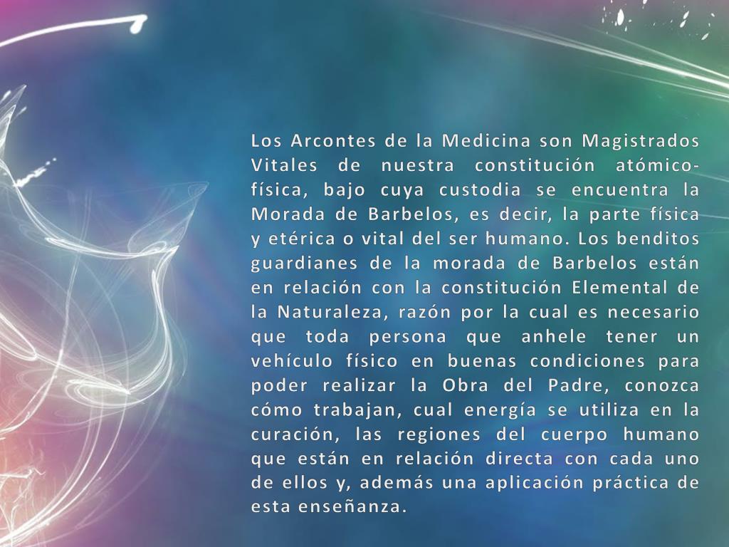 Los Arcontes de la Medicina son Magistrados Vitales de nuestra constitución atómico-física, bajo cuya custodia se encuentra la Morada de Barbelos, es decir, la parte física y etérica o vital del ser humano. Los benditos guardianes de la morada de Barbelos están en relación con la constitución Elemental de la Naturaleza, razón por la cual es necesario que toda persona que anhele tener un vehículo físico en buenas condiciones para poder realizar la Obra del Padre, conozca cómo trabajan, cual energía se utiliza en la curación, las regiones del cuerpo humano que están en relación directa con cada uno de ellos y, además una aplicación práctica de esta enseñanza.