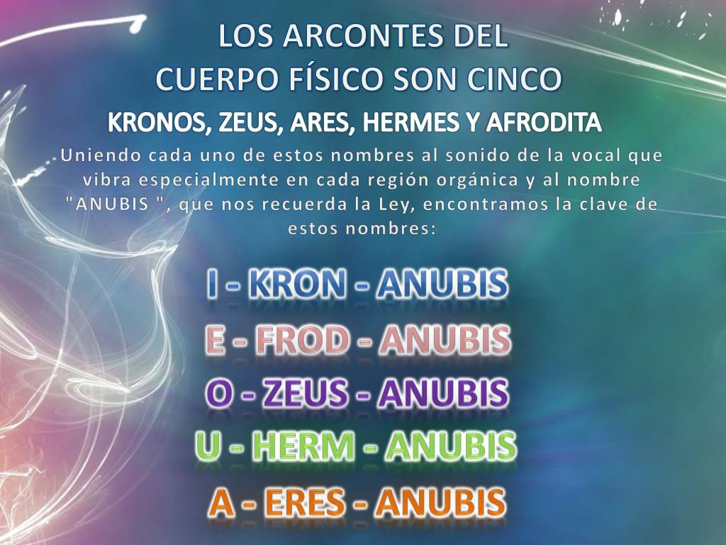 LOS ARCONTES DEL CUERPO FÍSICO SON CINCO KRONOS, ZEUS, ARES, HERMES Y AFRODITA Uniendo cada uno de estos nombres al sonido de la vocal que vibra especialmente en cada región orgánica y al nombre "ANUBIS ", que nos recuerda la Ley, encontramos la clave de estos nombres: I - KRON - ANUBIS E - FROD - ANUBIS O - ZEUS - ANUBIS U - HERM - ANUBIS A - ERES - ANUBIS
