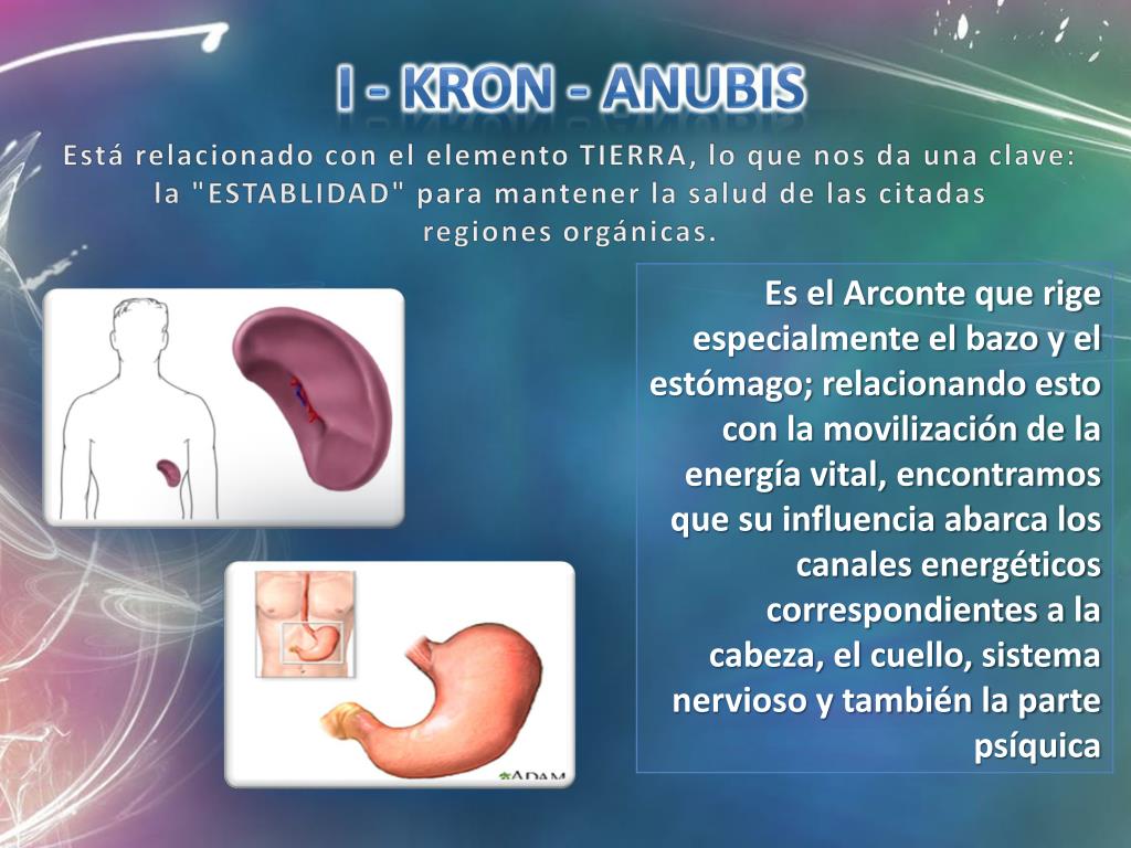 I - KRON - ANUBIS Está relacionado con el elemento TIERRA, lo que nos da una clave: la "ESTABLIDAD" para mantener la salud de las citadasregiones orgánicas.