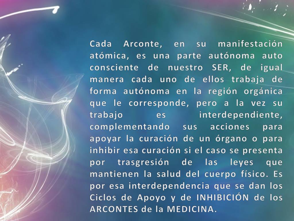 Cada Arconte, en su manifestación atómica, es una parte autónoma auto consciente de nuestro SER, de igual manera cada uno de ellos trabaja de forma autónoma en la región orgánica que le corresponde, pero a la vez su trabajo es interdependiente, complementando sus acciones para apoyar la curación de un órgano o para inhibir esa curación si el caso se presenta por trasgresión de las leyes que mantienen la salud del cuerpo físico. Es por esa interdependencia que se dan los Ciclos de Apoyo y de INHIBICIÓN de los ARCONTES de la MEDICINA.
