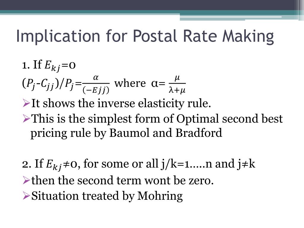Implication for Postal Rate Making 1. If =0 (-)/=α= • It shows the inverse elasticity rule. • This is the simplest form of Optimal second best pricing rule by Baumol and Bradford 2. If ≠0, for some or all j/k=1…..n and j≠k • then the second term wont be zero. • Situation treated by Mohring