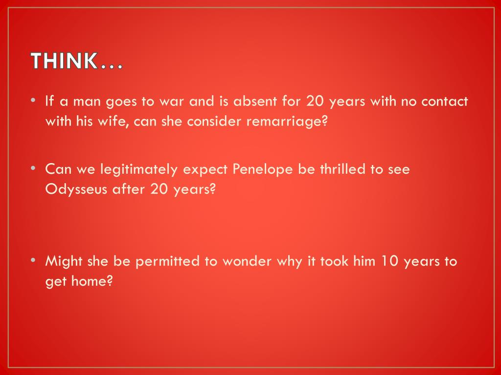 THINK… • If a man goes to war and is absent for 20 years with no contact with his wife, can she consider remarriage? • Can we legitimately expect Penelope be thrilled to see Odysseus after 20 years? • Might she be permitted to wonder why it took him 10 years to get home?