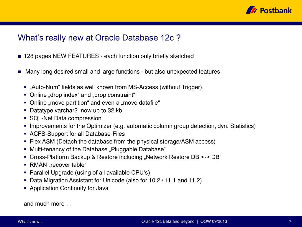 Consolidation with Oracle Database 12c: Experiences from the Beta Program and Beyond. Jens-Christian Pokolm, BPD. Postbank – At a Glance. Beta-Test … why we joined the program ?. What’s new at the new release ?. What we had a precise look on ?. Pluggable Database. Conclusion. Flex ASM.