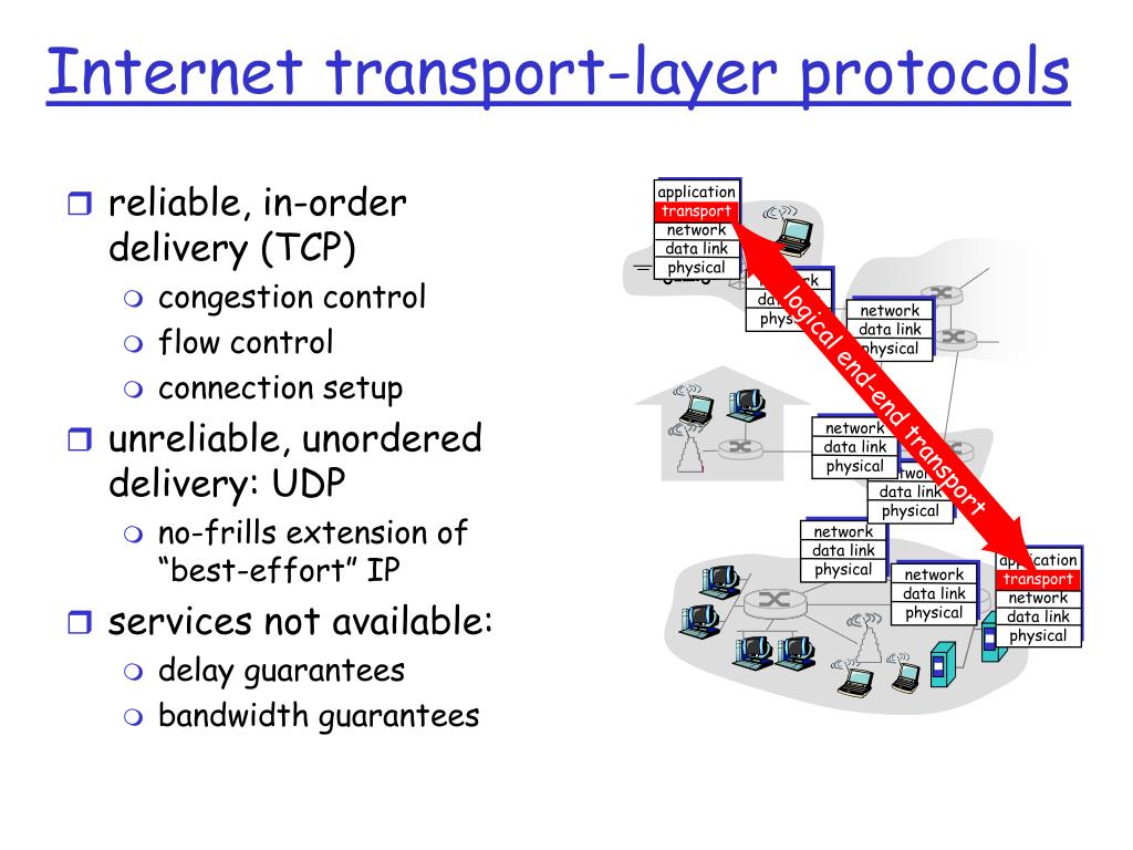 reliable, in-order delivery (TCP) congestion control flow control connection setup unreliable, unordered delivery: UDP no-frills extension of “best-effort” IP services not available: delay guarantees bandwidth guarantees application transport network data link physical application transport network data link physical network data link physical network data link physical network data link physical network data link physical network data link physical network data link physical logical end-end transport Internet transport-layer protocols