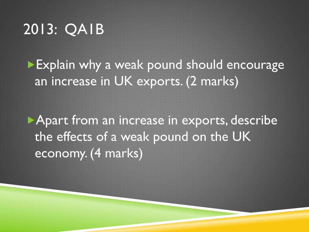 2013: QA1b • Explain why a weak pound should encourage an increase in UK exports. (2 marks) • Apart from an increase in exports, describe the effects of a weak pound on the UK economy. (4 marks)