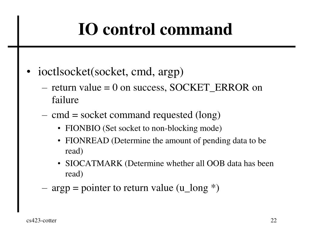 IO control command • ioctlsocket(socket, cmd, argp) • return value = 0 on success, SOCKET_ERROR on failure • cmd = socket command requested (long) • FIONBIO (Set socket to non-blocking mode) • FIONREAD (Determine the amount of pending data to be read) • SIOCATMARK (Determine whether all OOB data has been read) • argp = pointer to return value (u_long *)