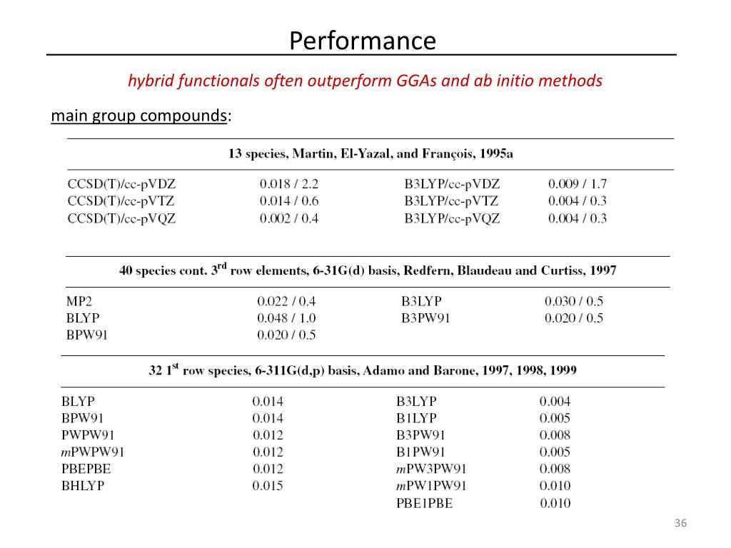 Performance hybrid functionals often outperform their GGA counterparts atomization energies are a major testing ground for energetics: • SVWN = LDA; PBE = GGA, non-empirical; BLYP = GGA, empirical; B3LYP = hybrid, empirical; PBE1PBE = hybrid, empirical; VSXC = meta-GGA, empirical in general, expected accuracy: SVWN << BP86 < BLYP ≈ BLYP < B3P86 < B3LYP ≈ B3PW91