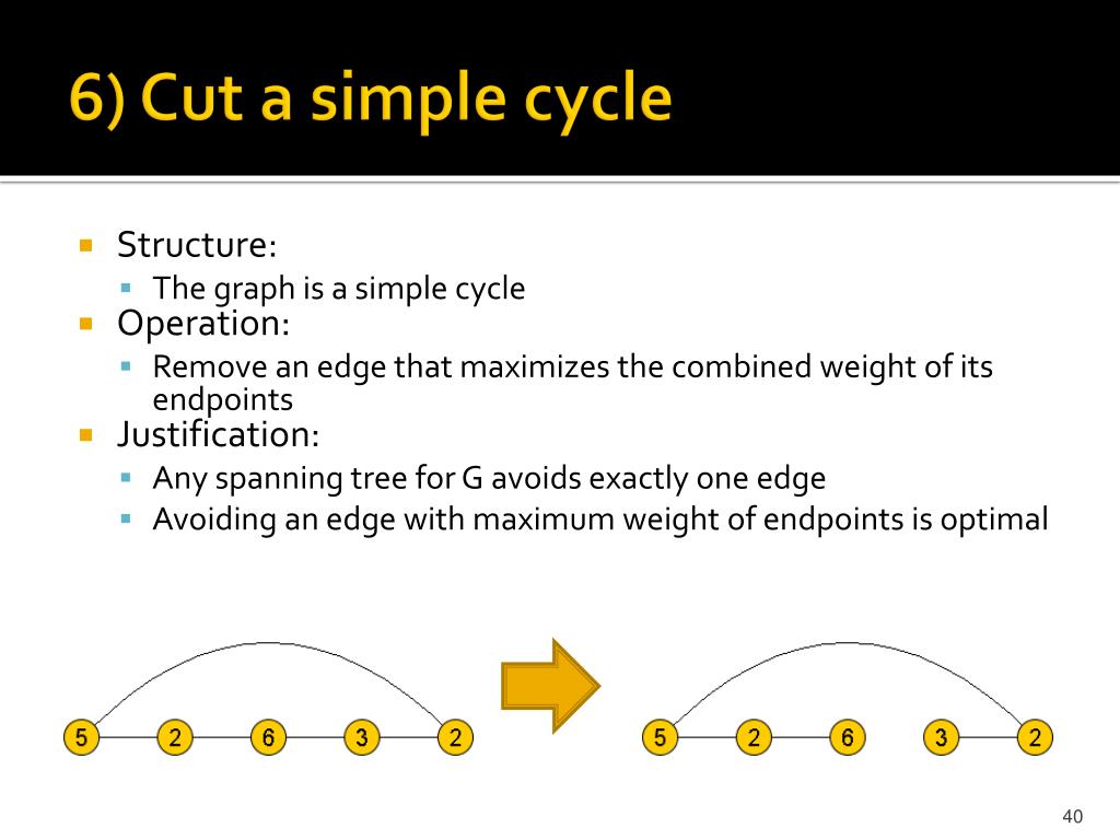 6) Cut a simplecycle • Structure: • The graph is a simple cycle • Operation: • Remove an edge that maximizes the combined weight of its endpoints • Justification: • Any spanning tree for G avoidsexactlyoneedge • Avoidinganedgewith maximum weight of endpoints is optimal