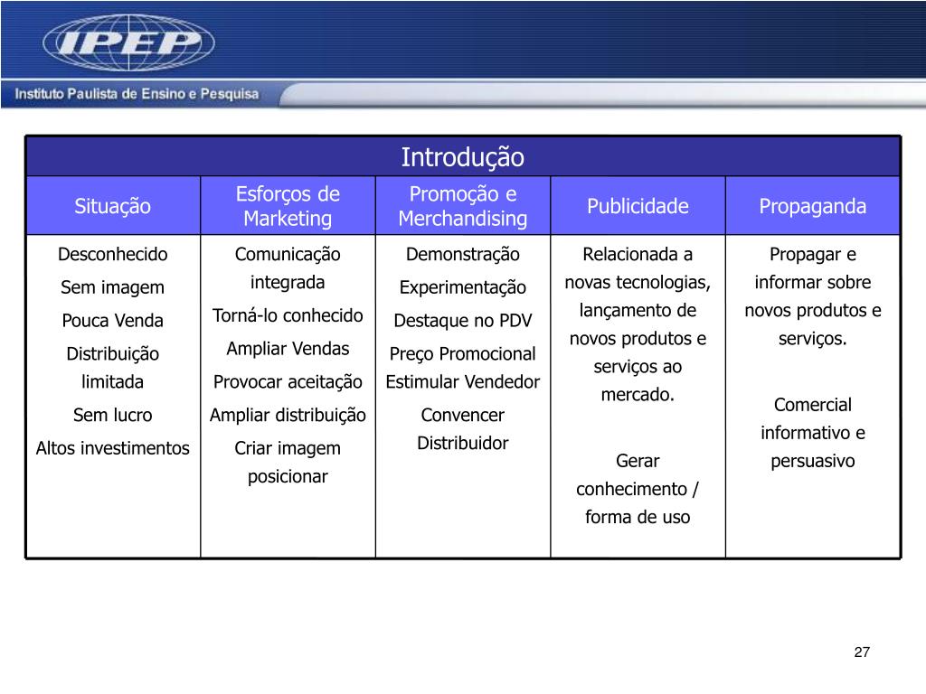 Introdução Situação Esforços de Marketing Promoção e Merchandising Publicidade Propaganda Desconhecido Sem imagem Pouca Venda Distribuição limitada Sem lucro Altos investimentos Comunicação integrada Torná-lo conhecido Ampliar Vendas Provocar aceitação Ampliar distribuição Criar imagem posicionar Demonstração Experimentação Destaque no PDV Preço PromocionalEstimular Vendedor Convencer Distribuidor Relacionada a novas tecnologias, lançamento de novos produtos e serviços ao mercado. Gerar conhecimento / forma de uso Propagar e informar sobre novos produtos e serviços. Comercial informativo e persuasivo