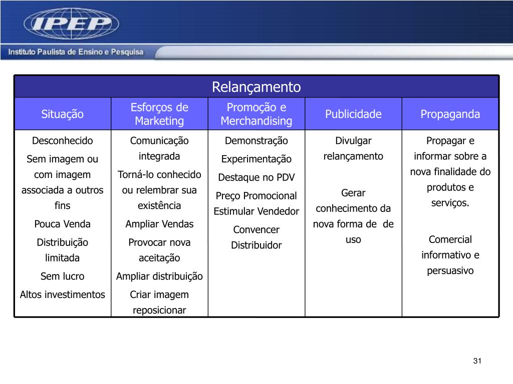 Relançamento Situação Esforços de Marketing Promoção e Merchandising Publicidade Propaganda Desconhecido Sem imagem ou com imagem associada a outros fins Pouca Venda Distribuição limitada Sem lucro Altos investimentos Comunicação integrada Torná-lo conhecido ou relembrar sua existência Ampliar Vendas Provocar nova aceitação Ampliar distribuição Criar imagem reposicionar Demonstração Experimentação Destaque no PDV Preço PromocionalEstimular Vendedor Convencer Distribuidor Divulgar relançamento Gerar conhecimento da nova forma de de uso Propagar e informar sobre a nova finalidade do produtos e serviços. Comercial informativo e persuasivo