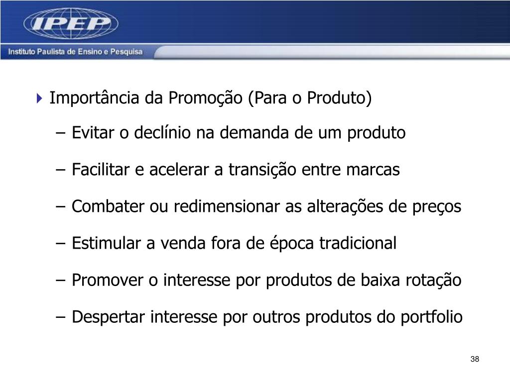 Importância da Promoção (Para o Mercado) • Apresentar novos produtos/serviços (posicionar) • Proporcionar contato mais íntimo do produtos/serviços com o consumidor • Exibir alterações nos produtos (reposicionamento) • Aproveitar ciclos de moda • Link entre os esforços de publicitários e de vendas • Motivar varejistas • Fidelizar clientes