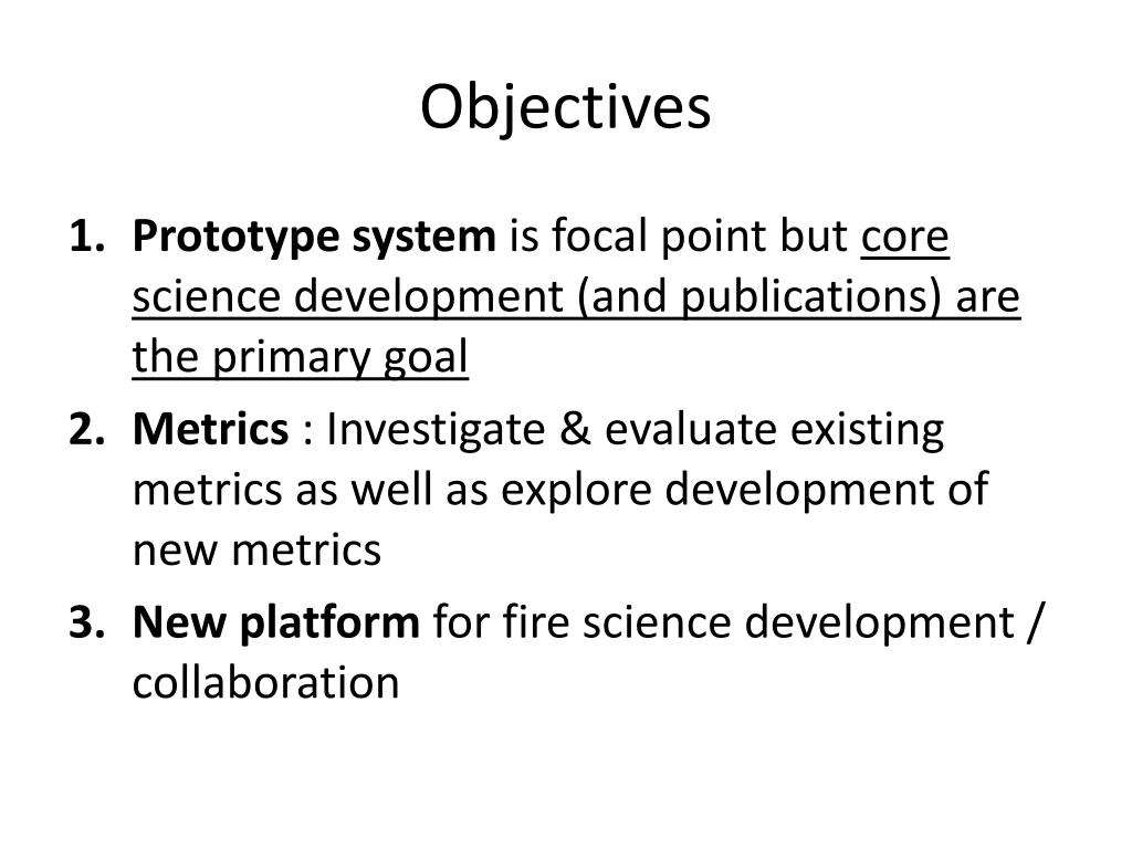 Objectives • Prototype system is focal point but core science development (and publications) are the primary goal • Metrics : Investigate & evaluate existing metrics as well as explore development of new metrics • New platform for fire science development / collaboration