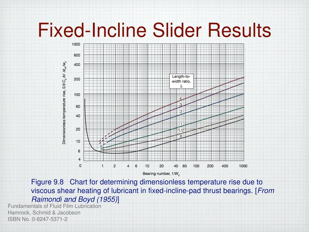 Fixed-Incline Slider Results Figure 9.8 Chart for determining dimensionless temperature rise due to viscous shear heating of lubricant in fixed-incline-pad thrust bearings. [From Raimondi and Boyd (1955)]