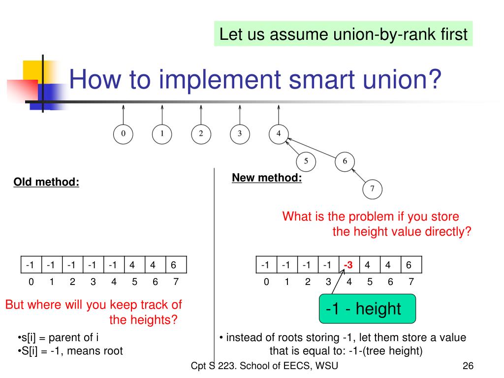 Let us assume union-by-rank first How to implement smart union? New method: Old method: What is the problem if you store the height value directly? But where will you keep track of the heights? -1 - height • s[i] = parent of i • S[i] = -1, means root • instead of roots storing -1, let them store a value that is equal to: -1-(tree height) Cpt S 223. School of EECS, WSU
