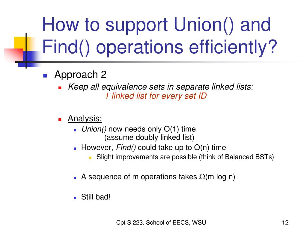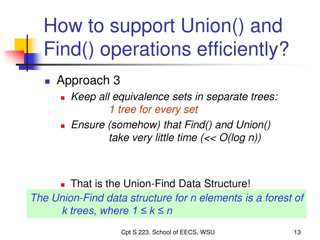 How to support Union() and Find() operations efficiently? • Approach 1 • Keep the elements in the form of an array, where: A[i] stores the current set ID for element i • Analysis: • Find() will take O(1) time • Union() could take up to O(n) time • Therefore a sequence of m (union and find) operations could take O(m n) in the worst case • This is bad! Cpt S 223. School of EECS, WSU
