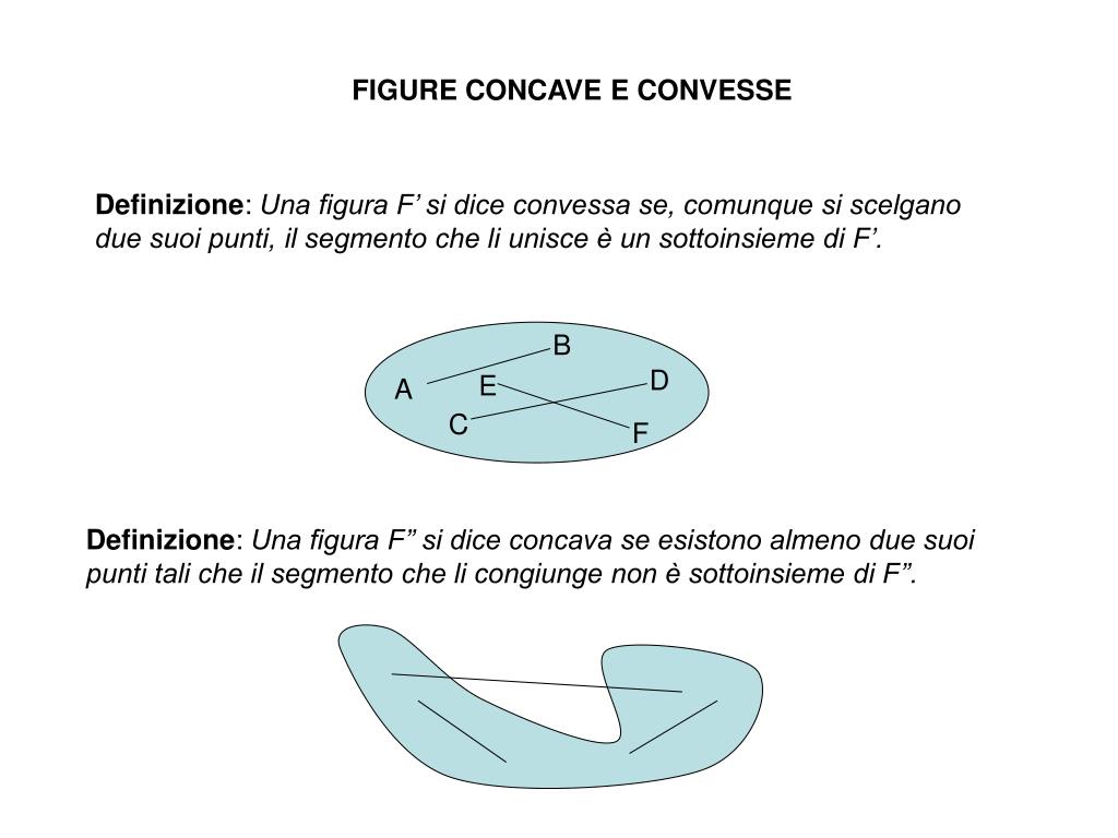 FIGURE CONCAVE E CONVESSE Definizione: Una figura F’ si dice convessa se, comunque si scelgano due suoi punti, il segmento che li unisce è un sottoinsieme di F’. B D E A C F Definizione: Una figura F’’ si dice concava se esistono almeno due suoi punti tali che il segmento che li congiunge non è sottoinsieme di F’’.