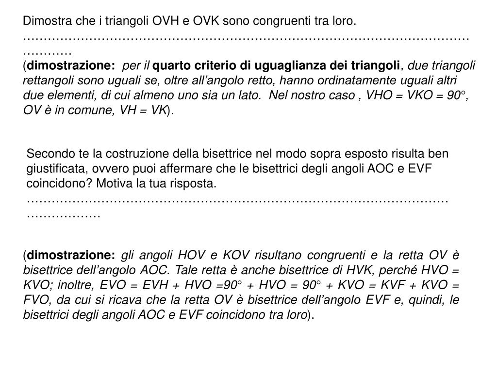 Dimostra che i triangoli OVH e OVK sono congruenti tra loro. ………………………………………………………………………………………………………… (dimostrazione:per il quarto criterio di uguaglianza dei triangoli, due triangoli rettangoli sono uguali se, oltre all’angolo retto, hanno ordinatamente uguali altri due elementi, di cui almeno uno sia un lato. Nel nostro caso , VHO = VKO = 90°, OV è in comune, VH = VK). Secondo te la costruzione della bisettrice nel modo sopra esposto risulta ben giustificata, ovvero puoi affermare che le bisettrici degli angoli AOC e EVF coincidono? Motiva la tua risposta. ………………………………………………………………………………………………………… (dimostrazione: gli angoli HOV e KOV risultano congruenti e la retta OV è bisettrice dell’angolo AOC. Tale retta è anche bisettrice di HVK, perché HVO = KVO; inoltre, EVO = EVH + HVO =90° + HVO = 90° + KVO = KVF + KVO = FVO, da cui si ricava che la retta OV è bisettrice dell’angolo EVF e, quindi, le bisettrici degli angoli AOC e EVF coincidono tra loro).
