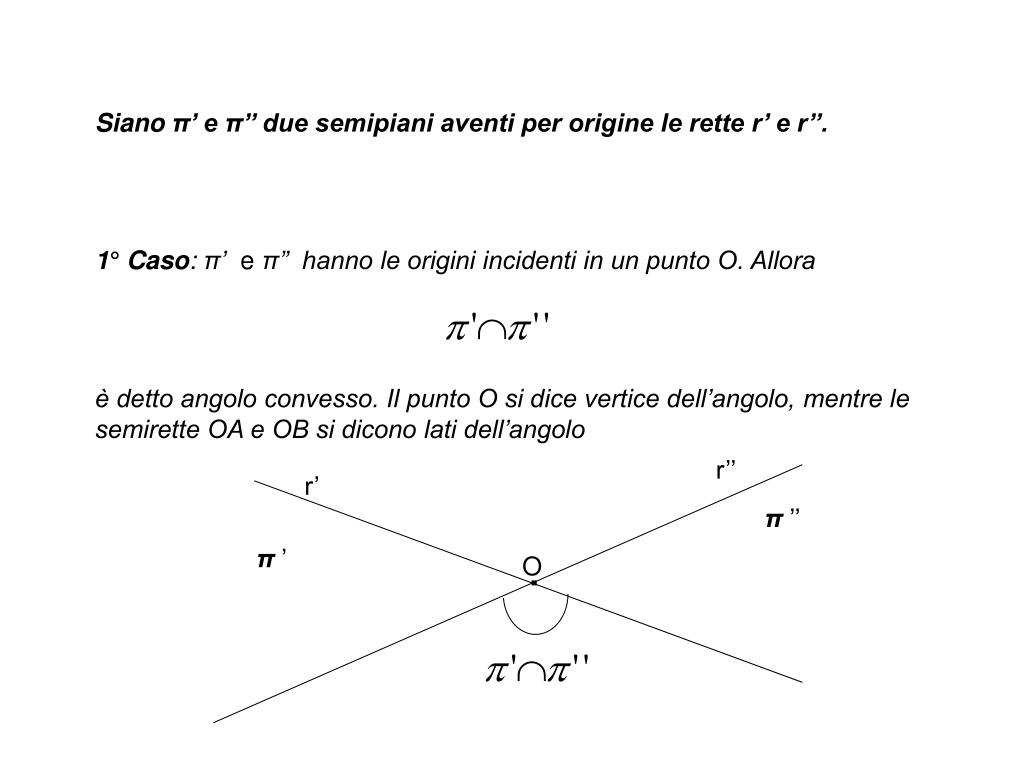 Siano π’ e π’’ due semipiani aventi per origine le rette r’ e r’’. 1° Caso: π’ e π’’ hanno le origini incidenti in un punto O. Allora è detto angolo convesso. Il punto O si dice vertice dell’angolo, mentre le semirette OA e OB si dicono lati dell’angolo r’’ r’ π’’ π’ O .
