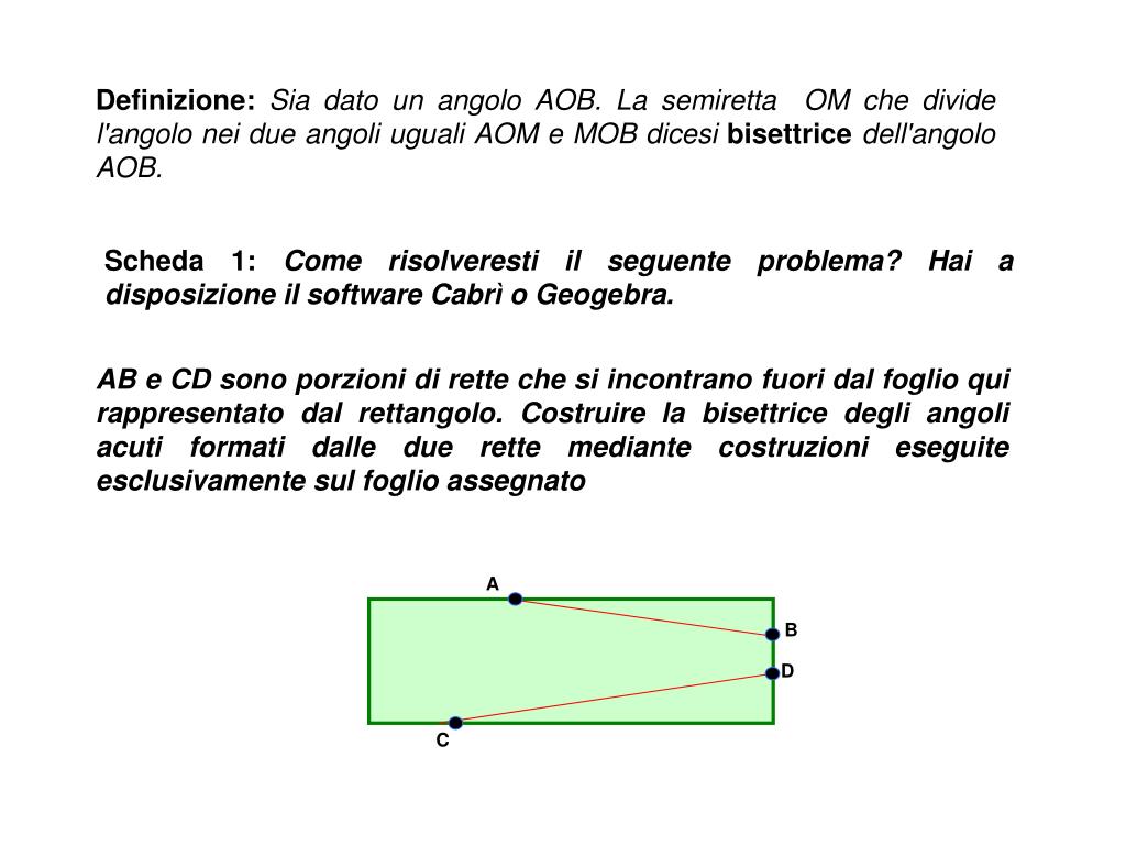 A B D C Definizione:Sia dato un angolo AOB. La semiretta OM che divide l'angolo nei due angoli uguali AOM e MOB dicesi bisettrice dell'angolo AOB. Scheda 1: Come risolveresti il seguente problema? Hai a disposizione il software Cabrì o Geogebra. AB e CD sono porzioni di rette che si incontrano fuori dal foglio qui rappresentato dal rettangolo. Costruire la bisettrice degli angoli acuti formati dalle due rette mediante costruzioni eseguite esclusivamente sul foglio assegnato