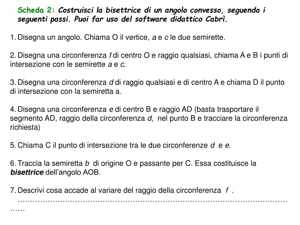 Scheda 2: Costruisci la bisettrice di un angolo convesso, seguendo i seguenti passi. Puoi far uso del software didattico Cabrì. • Disegna un angolo. Chiama O il vertice, a e c le due semirette. • Disegna una circonferenza f di centro O e raggio qualsiasi, chiama A e B i punti di intersezione con le semirette a e c. • Disegna una circonferenza d di raggio qualsiasi e di centro A e chiama D il punto di intersezione con la semiretta a. • Disegna una circonferenza e di centro B e raggio AD (basta trasportare il segmento AD, raggio della circonferenza d, nel punto B e tracciare la circonferenza richiesta) • Chiama C il punto di intersezione tra le due circonferenze d e e. • Traccia la semiretta b di origine O e passante per C. Essa costituisce la bisettrice dell’angolo AOB. • Descrivi cosa accade al variare del raggio della circonferenza f . • ……………………………………………………………………………………………………