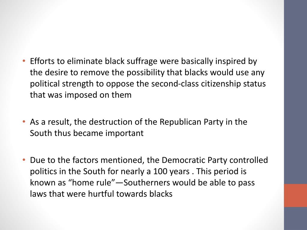Efforts to eliminate black suffrage were basically inspired by the desire to remove the possibility that blacks would use any political strength to oppose the second-class citizenship status that was imposed on them • As a result, the destruction of the Republican Party in the South thus became important • Due to the factors mentioned, the Democratic Party controlled politics in the South for nearly a 100 years . This period is known as “home rule”—Southerners would be able to pass laws that were hurtful towards blacks